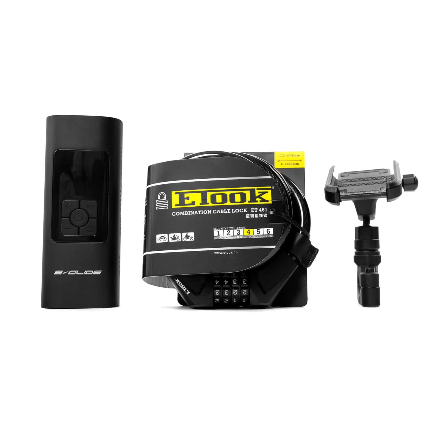 The E-Glide Accessory Kit comes jam packed with the E-Glide Air Pump 6000, E-Glide phone holder 025 and E-Took cable lock 461. All the best everyday needs for your E Scooter journeys.