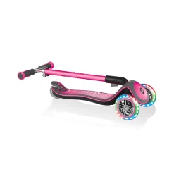 3-wheel light-up scooter with Globber’s patented elliptic folding system that folds the scooter into trolley mode without removing the T-bar. Conveniently carry, roll, or store it away after playtime!