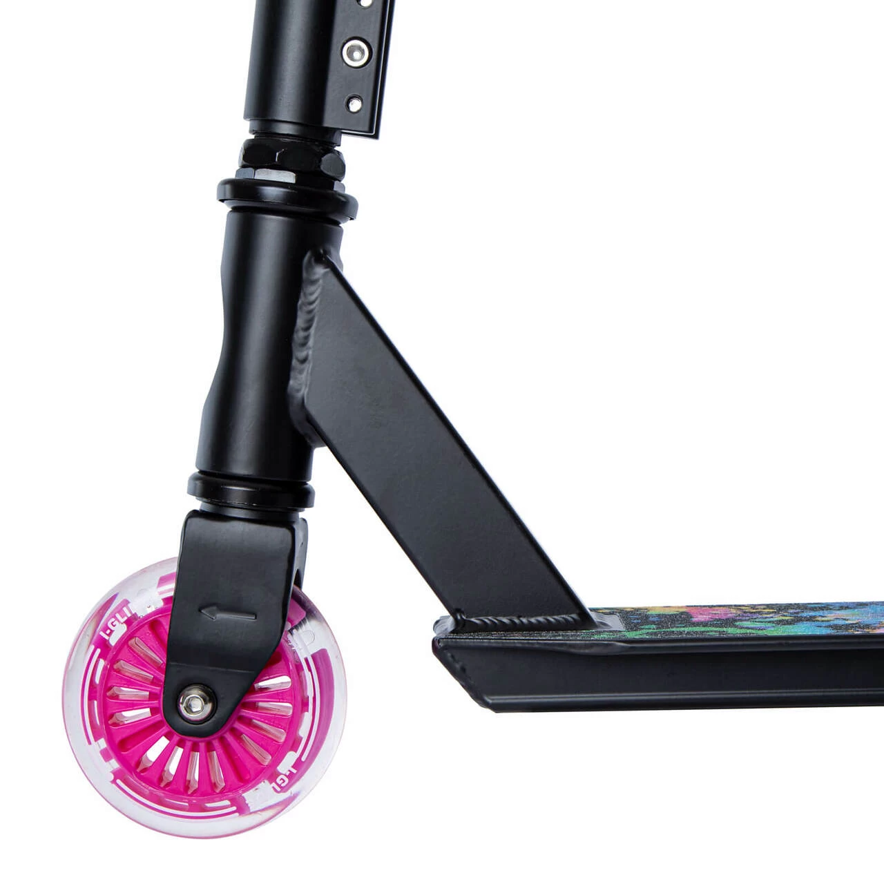 The JR 2-wheel scooter comes complete with LED light-up wheels with bright wheel cores, matching coloured handlebar grips and fun splatter griptape.
