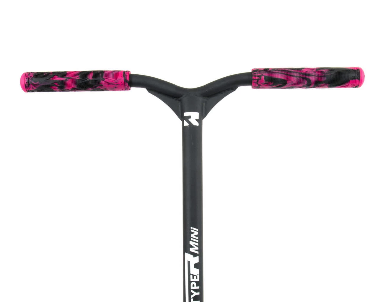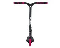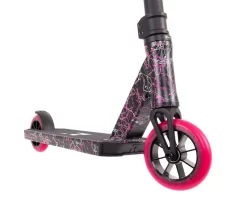 The pink and white splatter finish is complimented on this Mini scooter with Root Industries pink and black R2 groups and 8 spoke pink Pu 110mm wheels.