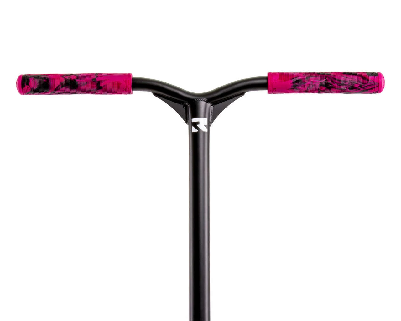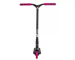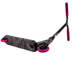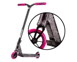 This unique pink and white paint finish on the scooter matches back with the Root Industry pink and black grips, black bars and hot pink wheels.